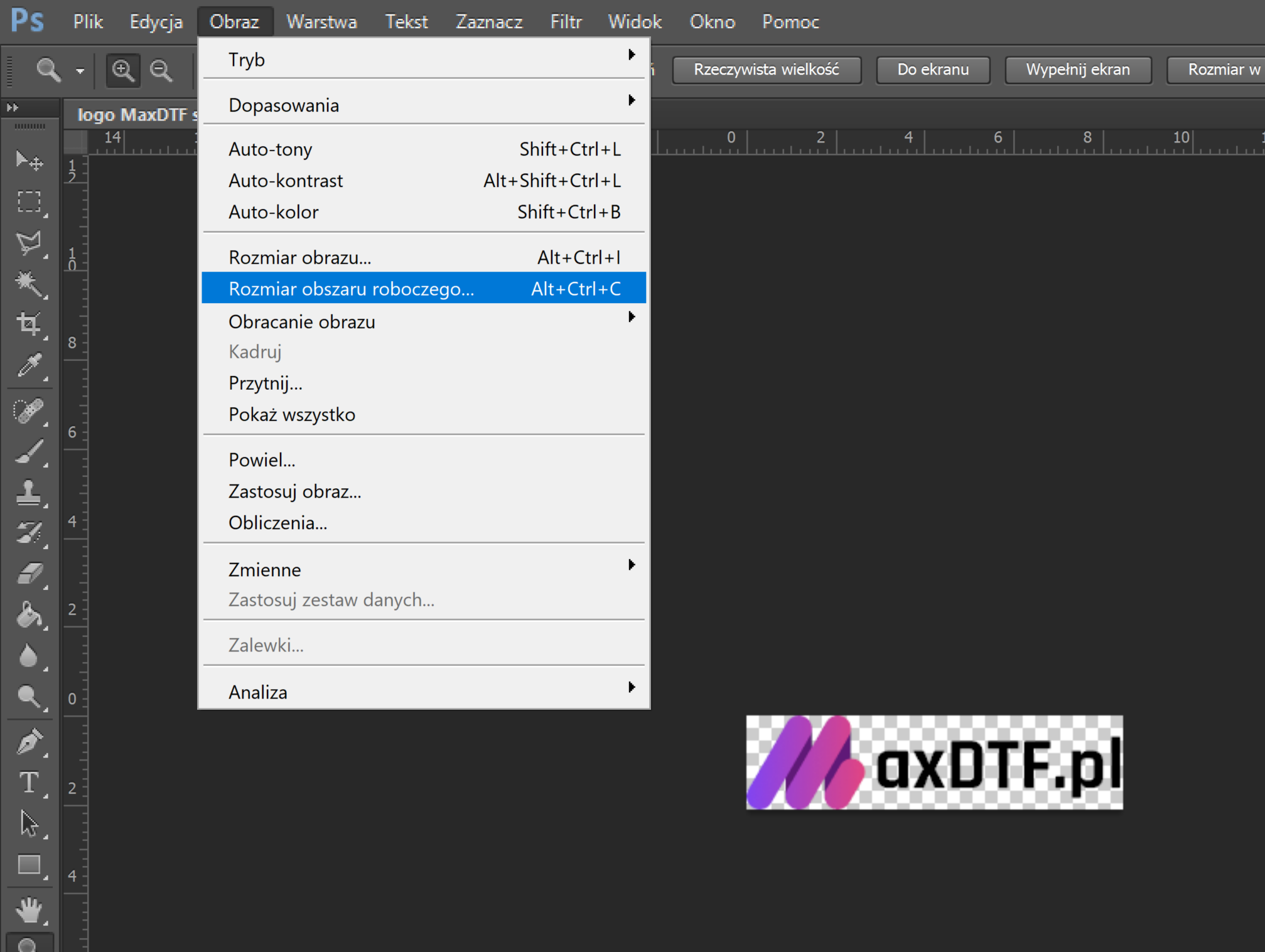 Ctrl + Alt + I lub Obraz > Rozmiar obrazu.